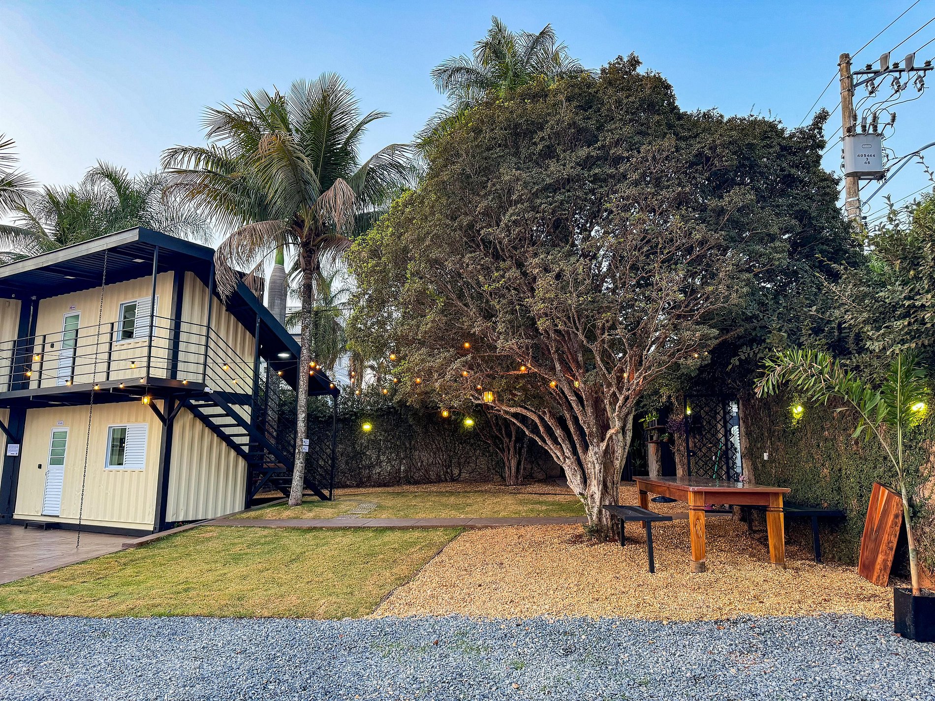Nossa habitação inovadora fornece praticidade e simplicidade para os hóspedes. Em nossos containers temos todos utensílios de cozinha, eletrodomésticos, camas confortáveis e um chuveiro com uma boa queda d´água. Nosso espaço externo conta com lavanderia, laguinho com peixes, e mesa para convívio compartilhado no meio da paisagem.